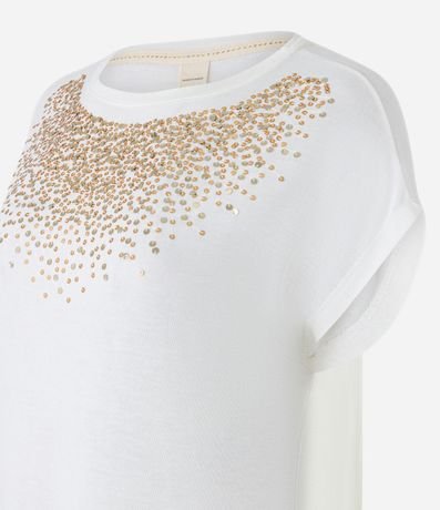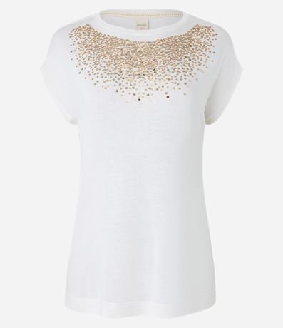 Ref: Blusa feminina, modelo t-shirt, confeccionada com viscose mais sustentável, gola redonda e manga curta. Peça com aplicação frontal de paetê.