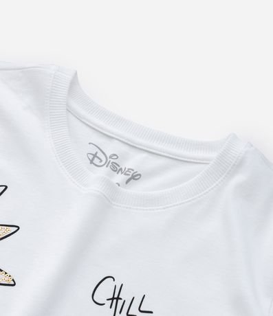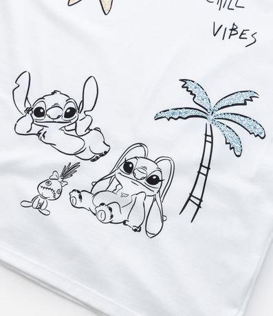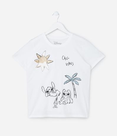 Ref: Blusa infantil de modelo t-shirt, confeccionada em malha de algodão mais responsável, com gola redonda e mangas curtas. Possui estampa frontal da animação Lilo & Stitch, com tema de praia e detalhes em paetês.