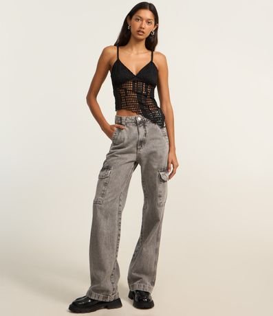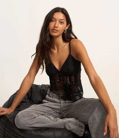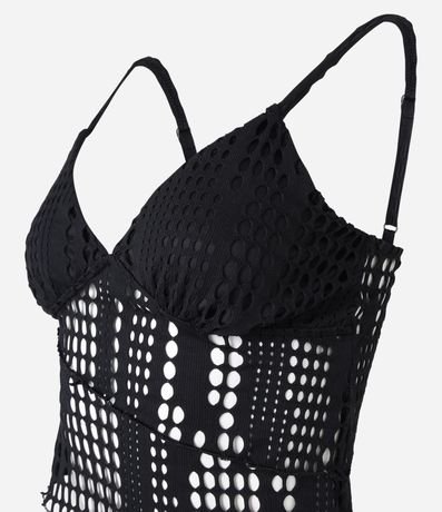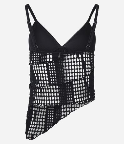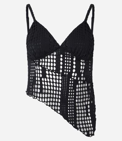 Ref: Blusa de alcinhas finas reguláveis, decote com forro, detalhes vazadinhos e barra assimétrica.