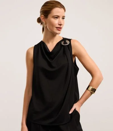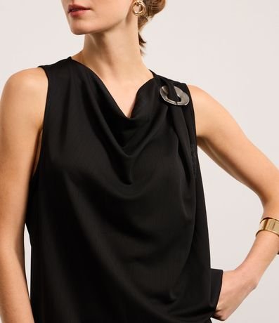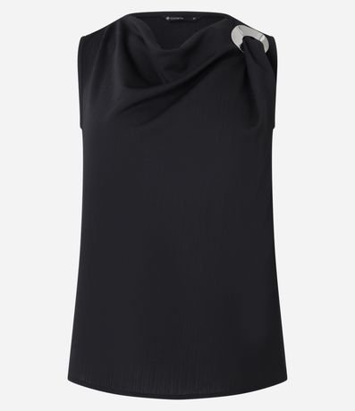 Blusa feminina confeccionada em poliéster, texturizada e de modelo sem manga. Possui gola degagê, alças largas e detalhe de fivela.
