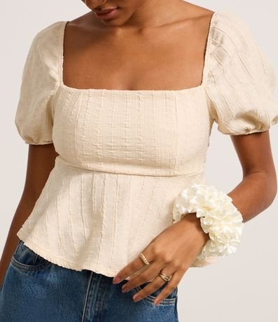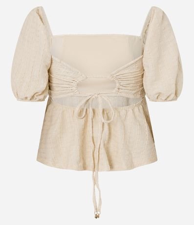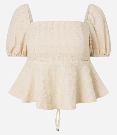 Ref: Blusa peplum de mangas curtas bufantes, confeccionada em tecido texturizado, com decote quadrado e amarração com vazados nas costas. As cordas para amarração nas costas dispõem de pingentes de pequenos corações metalizados.
