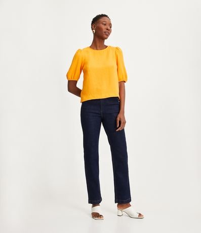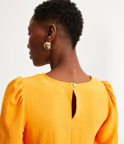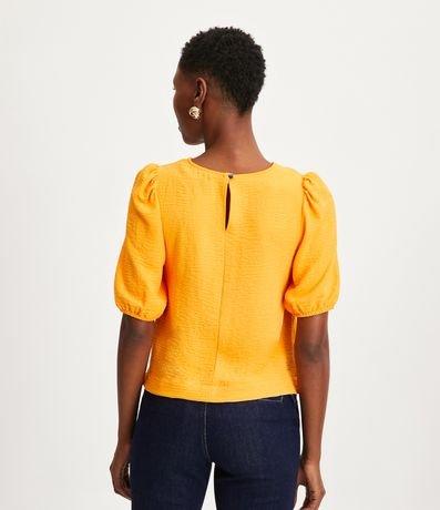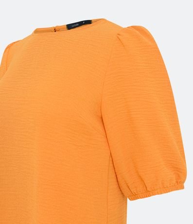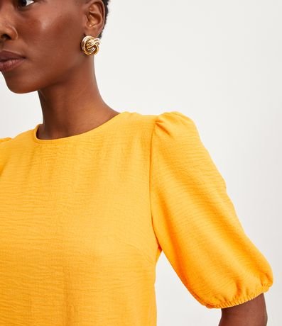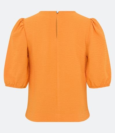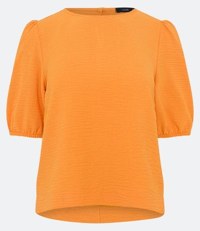 Ref: Blusa texturizada com gola redonda, manga curta bufante com elástico e detalhe de botãozinho nas costas.