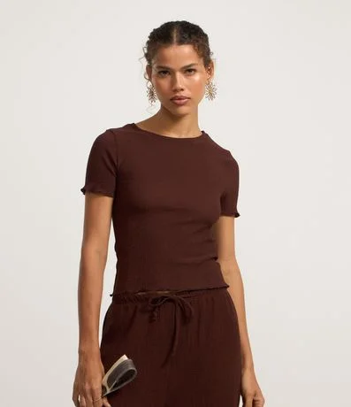 Blusa manga curta, justinha com textura em overlock e sem estampa.