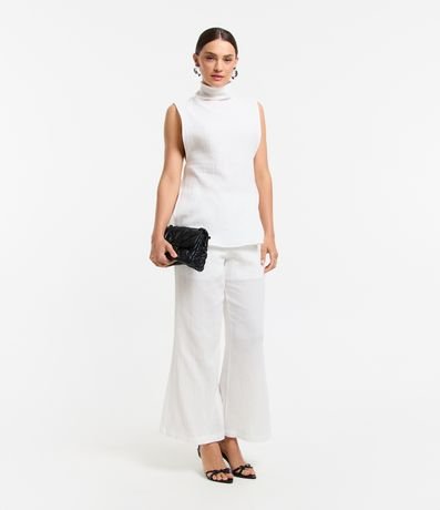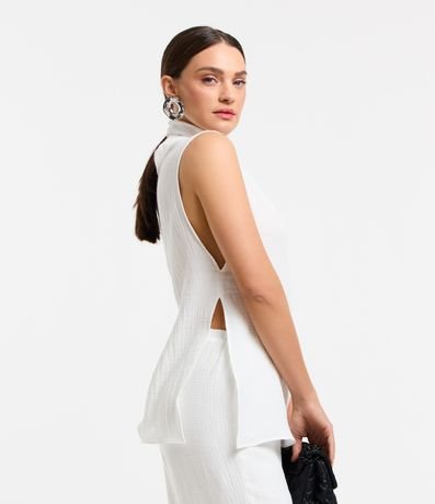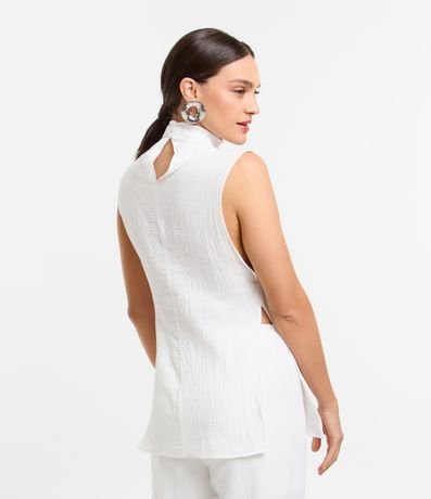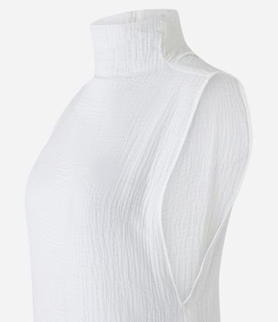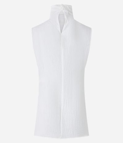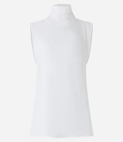 Blusa feminina confeccionada em malha de algodão texturizado, com gola alta e abertura em gota nas costas com botão. Sem mangas e sem estampa, possui detalhe de cavas amplas.