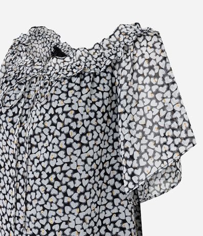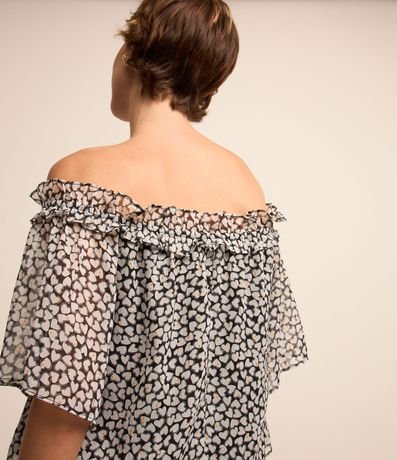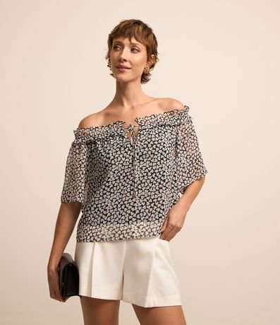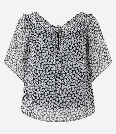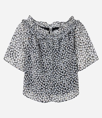 Ref: Blusa de mangas curtas confeccionada em chiffon com decote ombro a ombro com babados e amarração além de tecido texturizado. Estampada com pequenos corações com detalhes metalizados contrastantes.