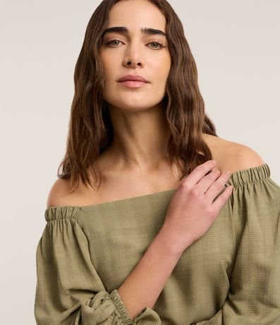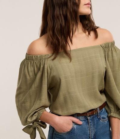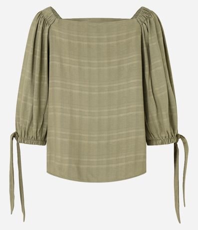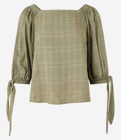 Ref: Blusa de mangas 3/4 com amarrações nos punhos além de decote quadrado e textura xadrez. Confeccionado em viscose mais sustentável.