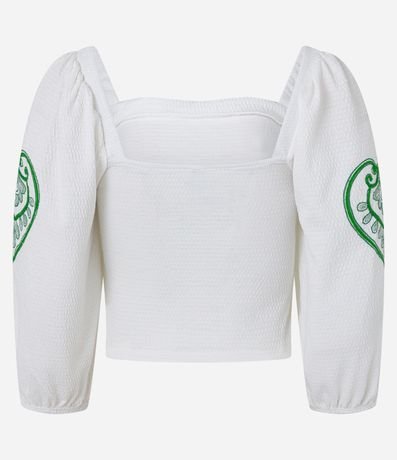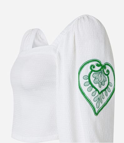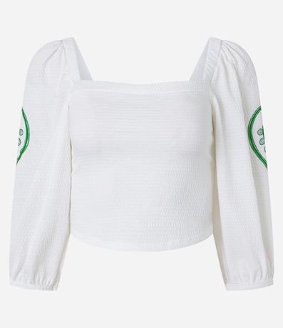 Ref: Blusa curta, texturizada com mangas 7/8 e com bordado loral na lateral da manga.