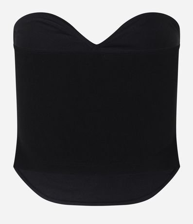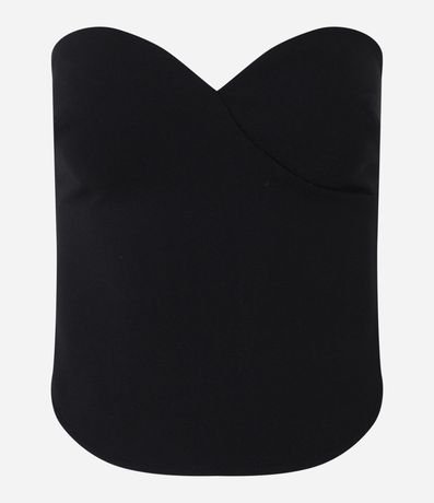 Blusa sem alças confeccionada em crepe com decote coração e busto recortado de maneira assimétrica.