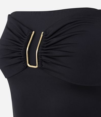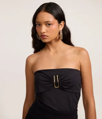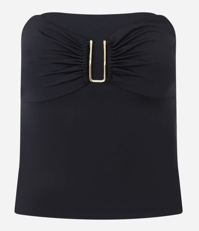 Blusa confeccionada em microfibra, com decote ombro a ombro e detalhe metálico dourado central que adiciona sofisticação ao visual. Modelagem ajustada e sem mangas, ideal para compor looks glamourosos em festas e happy hours com muito estilo.