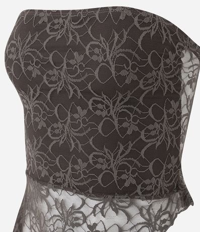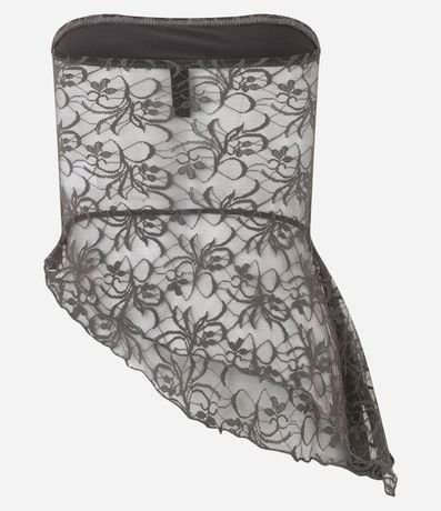 Ref: Blusa de renda tomara que caia. A barra não possui forro, apresentando um diferencial transparente, assim como nas costas, e o babado é assimétrico.
