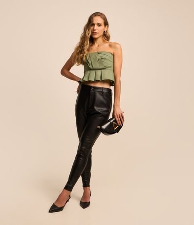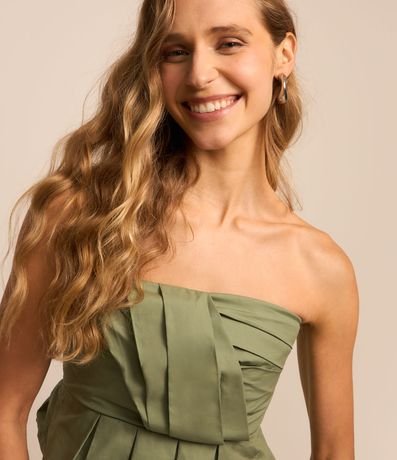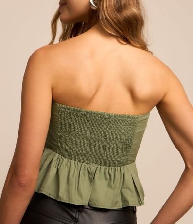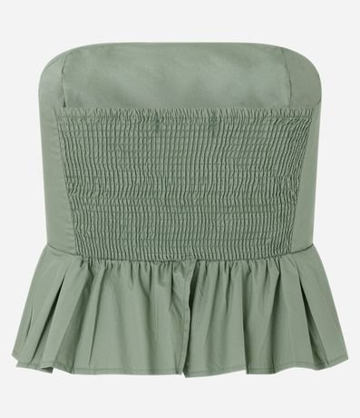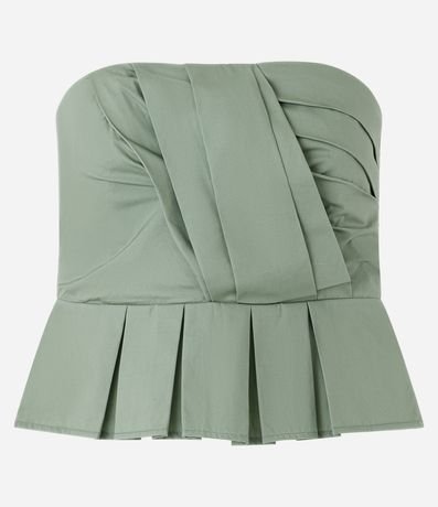 Blusa sem alças confeccionada em sarja leve com decote reto, fechamento lateral por zíper e lastex nas costas. O glamour da peça se dá por suas pregas frontais e babados na barra que se parecem com dobras origami.