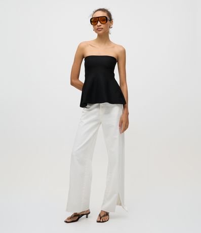 Blusa feminina em tricô através de boas práticas ambientais. Possui modelo tomara que caia e recorte com peplum na barra, que adiciona volume e movimento à peça.