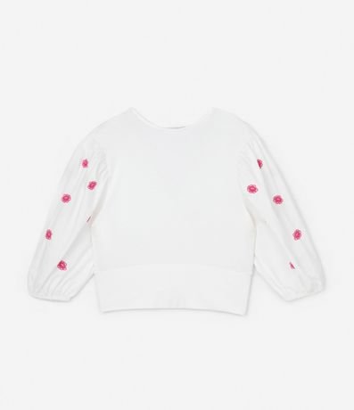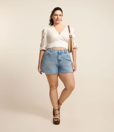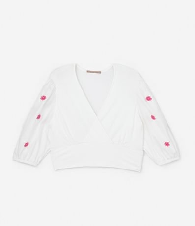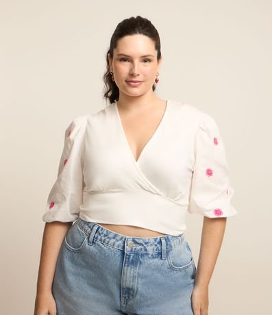 Blusa plus size com mangas 3/4, confeccionada em tricoline, com bordado de florzinhas nas mangas e decote v transpassado.