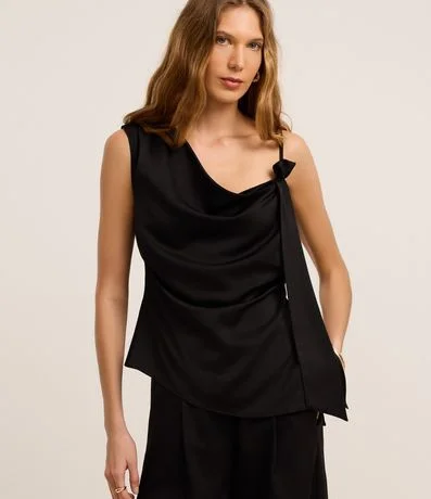 Blusa Túnica feminina confeccionada em material acetinado, alfaiataria com ombro único e detalhe de faixa amarrada e com caimento sobre a blusa.