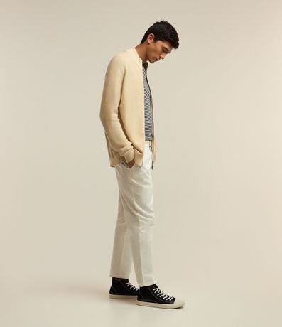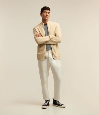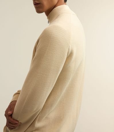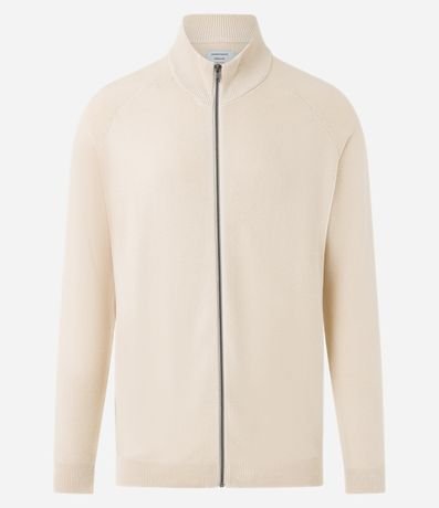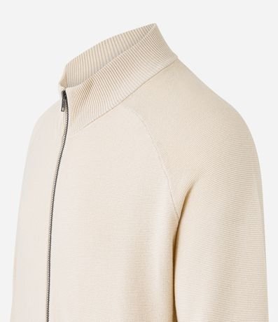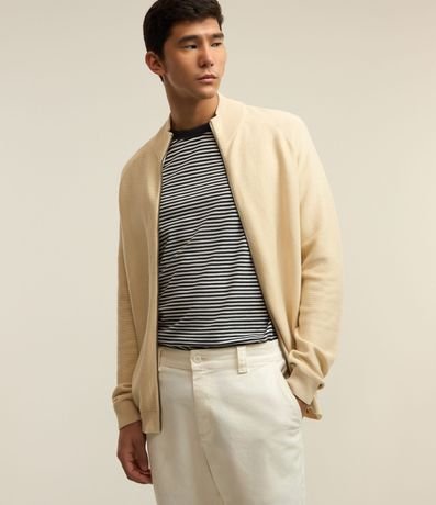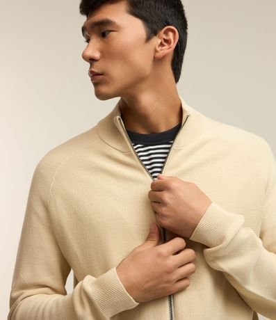 Ref: Blusão masculino, modelo aberto, confeccionado em algodão mais sustentável, com gola alta, fechamento frontal por zíper, manga longa. Peça contém textura.