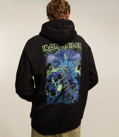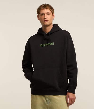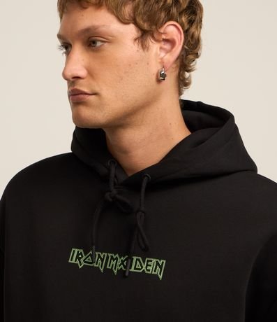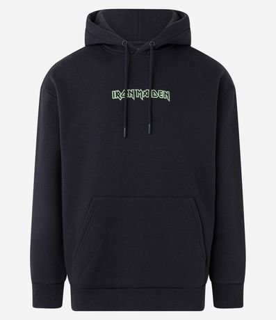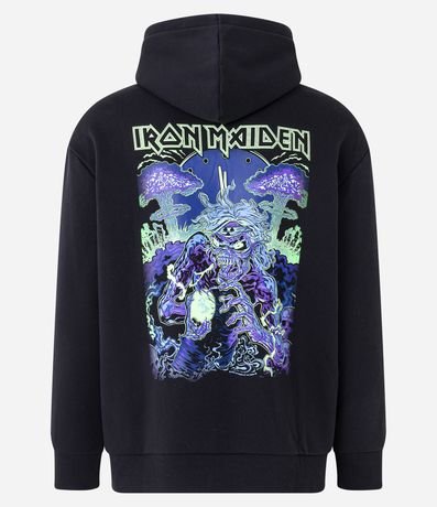 Ref: Blusão balloon, com forro em fleece, gola com capuz e cordão, bolsos canguru e estampa frente e costas, banda de rock, Iron Maiden.