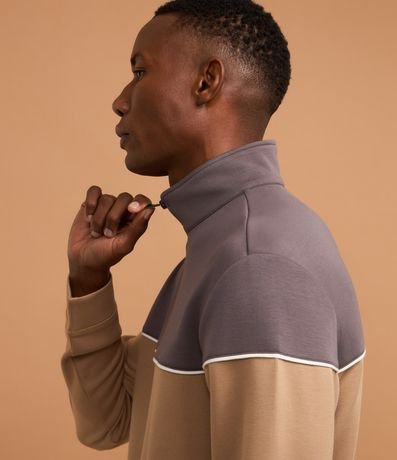Blusão masculino confeccionado em meia malha de poliéster e viscose, com zíper na gola alta e bloco de cor.