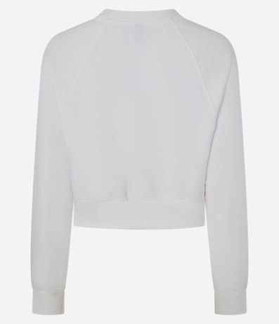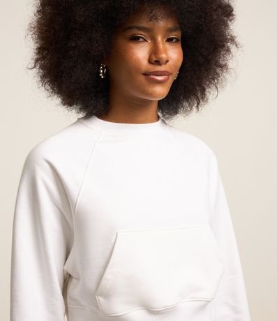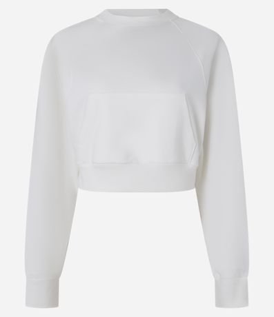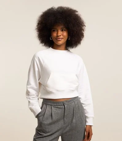 Blusão feminino confeccionado em moletom mais sustentável, no modelo cropped com gola redonda, manga longa e bolsos canguru.