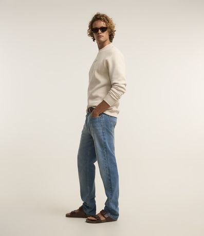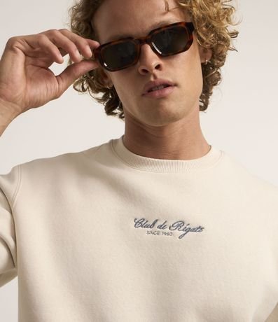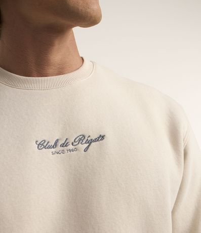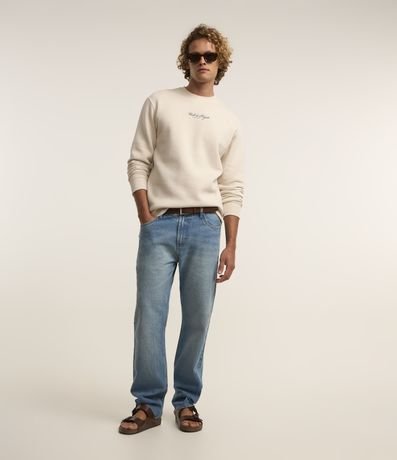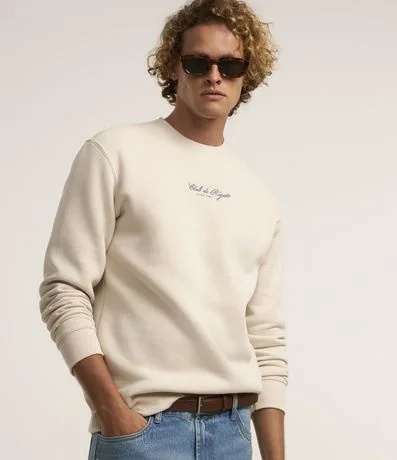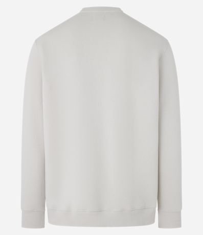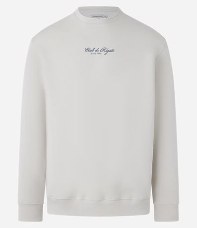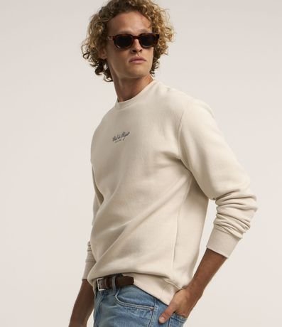 Blusão masculino confeccionado com material mais sustentável, gola redonda, mangas longas e estampa bordada lettering.