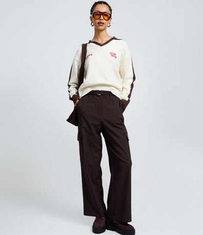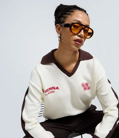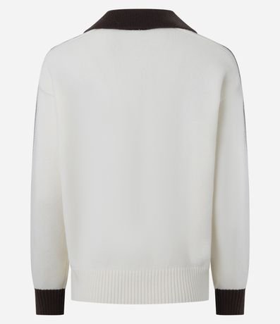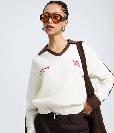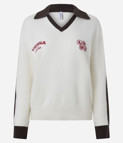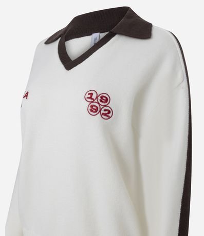 Blusão em tricô com gola polo contrastante e detalhes de lettering bordado que deixam o visual moderno e casual. Possui modelagem confortável, mangas longas e acabamentos canelados que reforçam o toque esportivo. Peça versátil para compor looks de meia-estação com estilo.