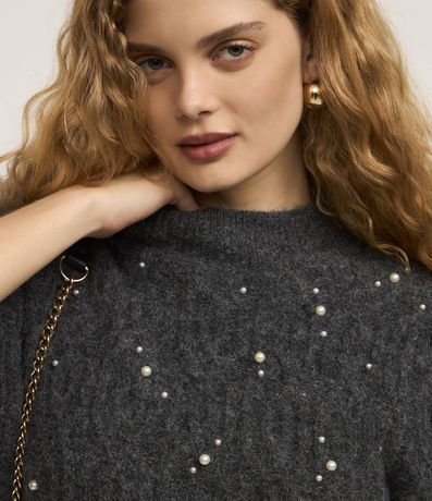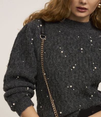 Blusão manga longa em tricô, pesado, com pérolas aplicadas.