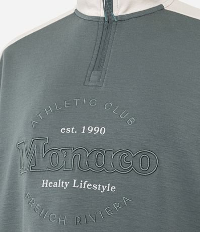 Blusão feminino esportivo confeccionado em modal. Possui gola alta contrastante, modelagem reta, mangas longas com punhos soltos, fechamento em zíper na gola e estampa central "monaco".