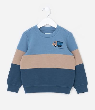 Blusão infantil confeccionado em modal. Possui gola redonda, manga longa, estampa bloco de cor e bordado no peito.