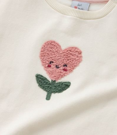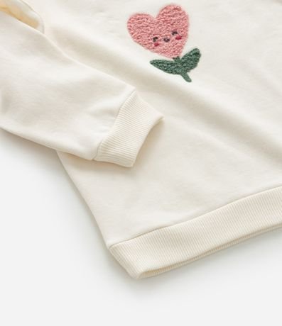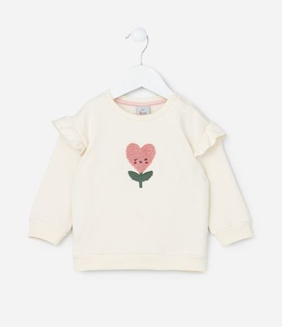 Blusão infantil confeccionado em moletom com forro quentinho, gola redonda, manga longa, babadinho nos ombros e bordado de tulipa sorridente.