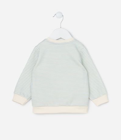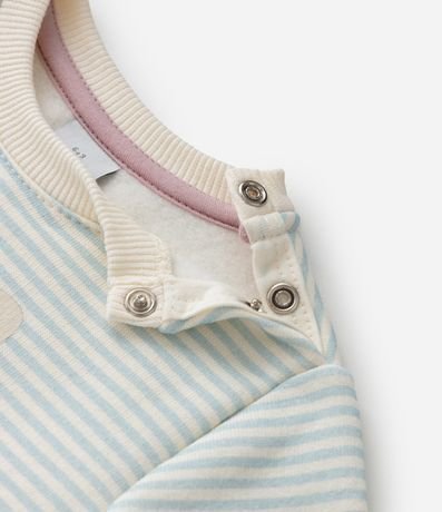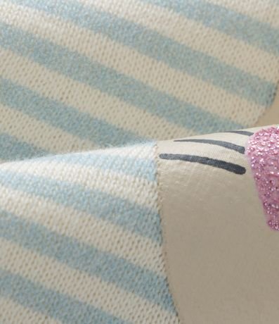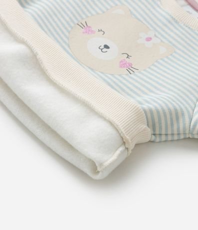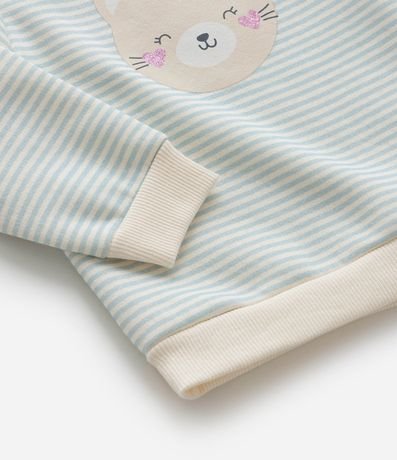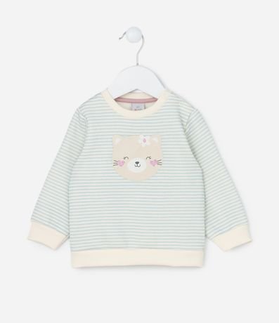Ref: Blusão de moletom felpudo confeccionado com algodão mais sustentável. A peça tem gola redonda com botões, mangas longas, fundo listrado e estampa frontal de gatinha com detalhe de glitter.