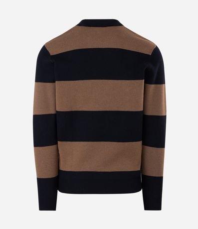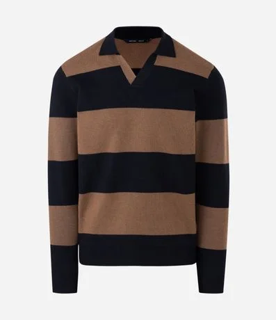 Ref: Blusão masculino confeccionado em meia malha com padronagem listrada e detalhe em lã na gola, com gola V, manga longa e visual casual confortável para o dia a dia.