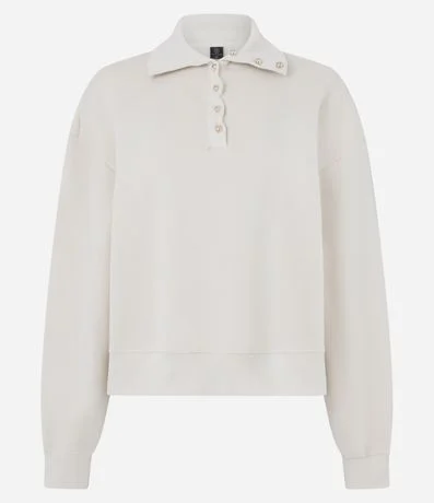 Ref: Blusão de moletom feminino confeccionado em algodão certificado, garantindo mais sustentabilidade ao produto. O modelo possui caimento regular, gola polo e botõezinhos delicados, trazendo um toque moderno ao visual. Uma peça versátil e confortável.