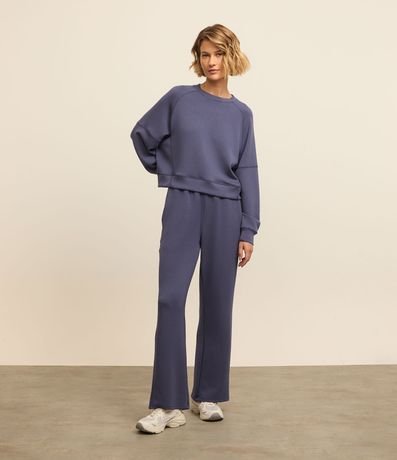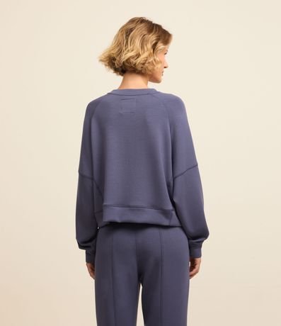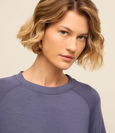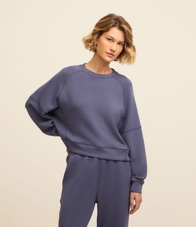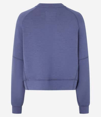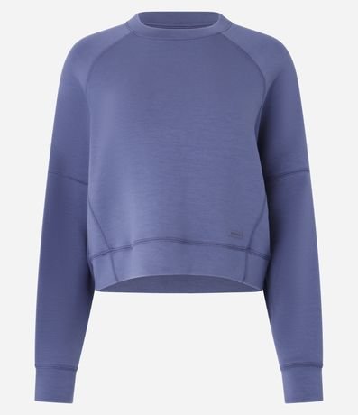 Blusão esportivo feminino, confeccionado em microfibra, com gola redonda, mangas raglan longas e recortes,