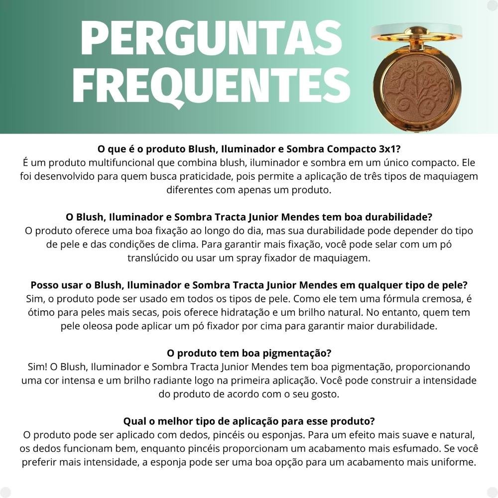 Posso usar o Blush, Iluminador e Sombra Tracta Junior Mendes em qualquer tipo de pele? Sim, o produto pode ser usado em todos os tipos de pele. Como ele tem uma fórmula cremosa, é ótimo para peles mais secas, pois oferece hidratação e um brilho natural. No entanto, quem tem pele oleosa pode aplicar um pó fixador por cima para garantir maior durabilidade.