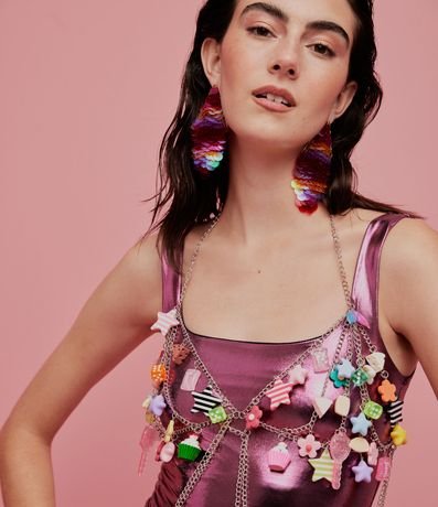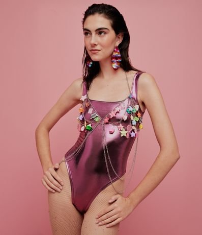 Ref: Body feminino confeccionado em flamê. Possui decote em u, alças largas e metalizado holográfico.