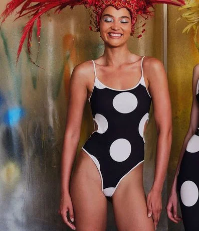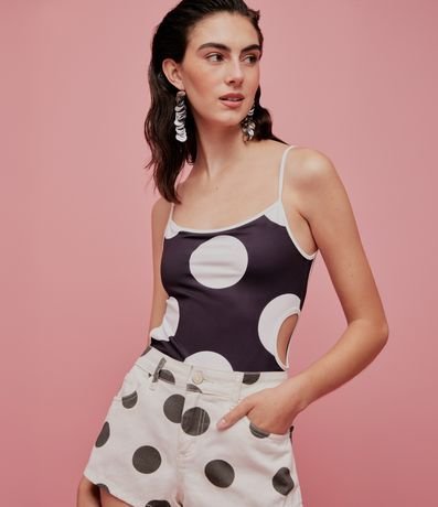 Ref: Body feminino confeccionado em poliéster, no modelo ajustado. Possui decote em u, alças finas, cut out lateral e estampa poá.