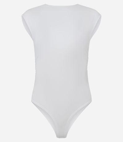 Body sem mangas, confeccionado em microfibra, com gola redonda, franzidos laterais e fechamento entreperna.