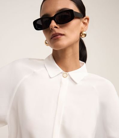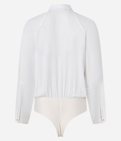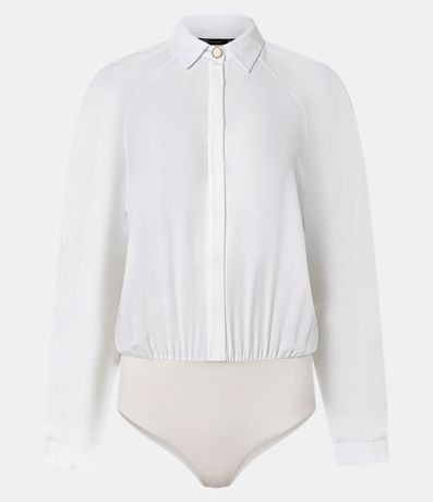 Ref: Camisa body de mangas longas com cavas raglan, confeccionada em crepe através de boas práticas ambientais, com colarinho na gola e abotoamento frontal com vista oculta. Peça tem botão diferenciado realçado logo abaixo do colarinho da gola.