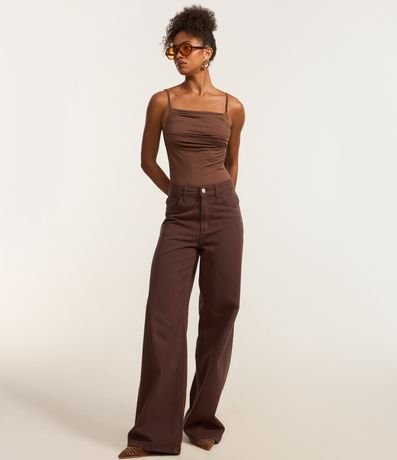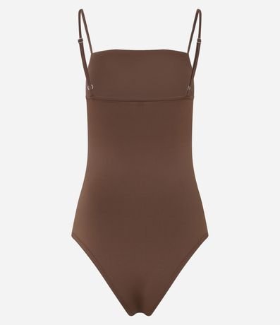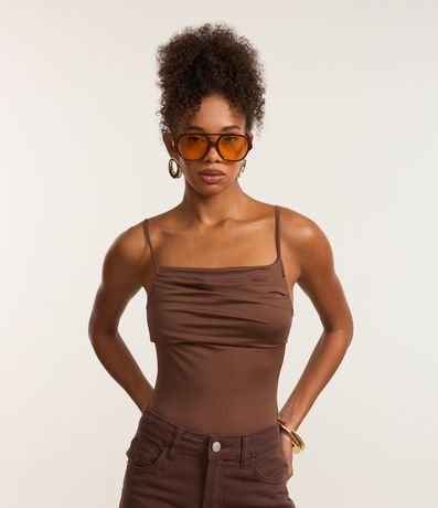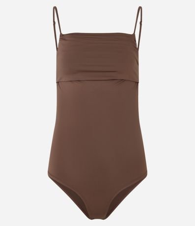 Body de alcinha fina, confeccionado em poliéster com elastano, pregas no busto e sem estampa.