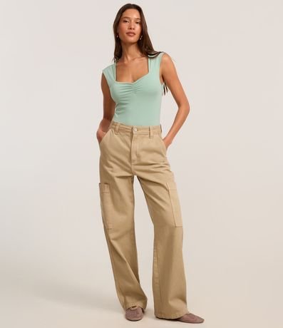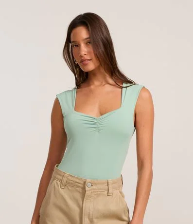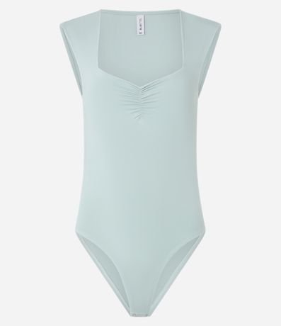 Body feminino confeccionado em poliamida e elastano, decote coração com franzidinho, alça larga.