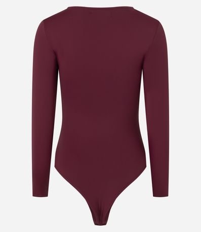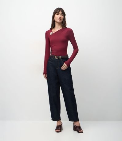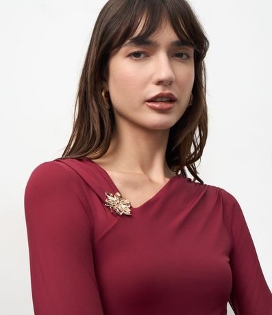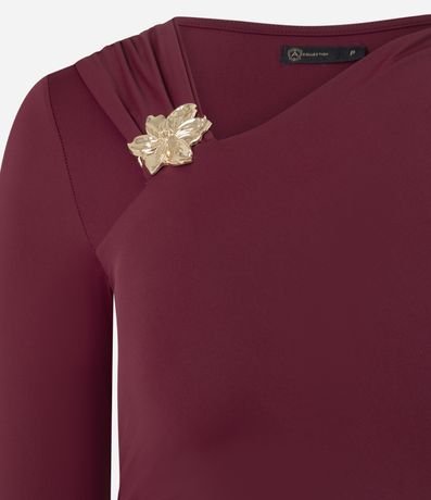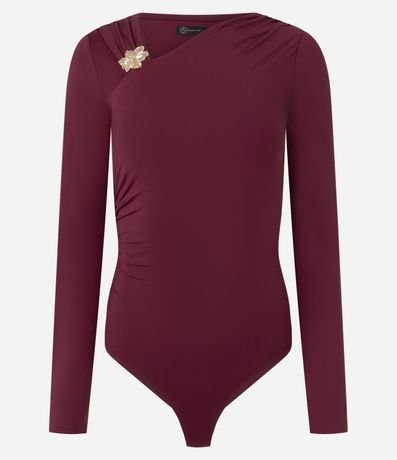 Ref: Body feminino confeccionado em poliamida. Possui modelo ajustado, mangas longas, decote assimétrico com detalhe de aviamento de flor delicada e drapeados na cintura e ombro.