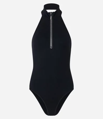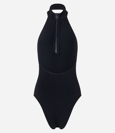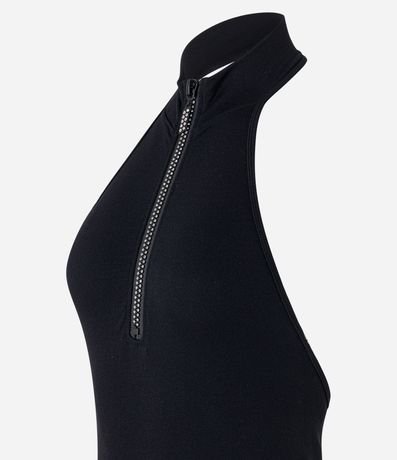 Body golinha alta com decote halter, confeccionado em poliamida seamless e zíper frontal.