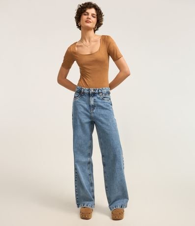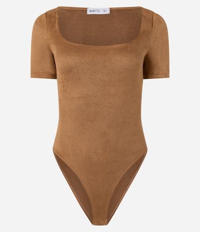 Ref: Body feminino, confeccionado em suede, com decote redondo, mangas 3/4 e superfície texturizada.
