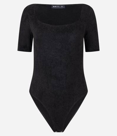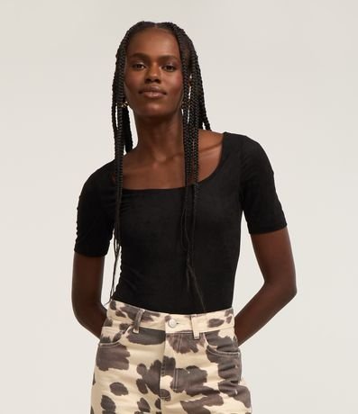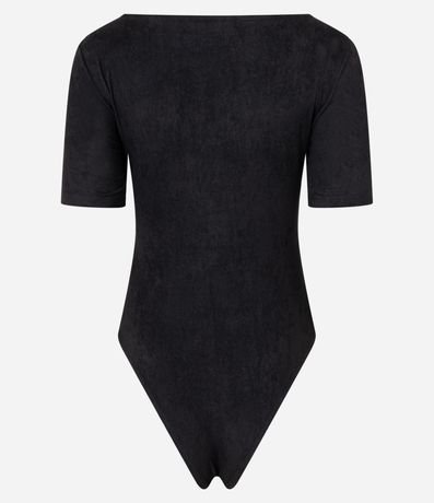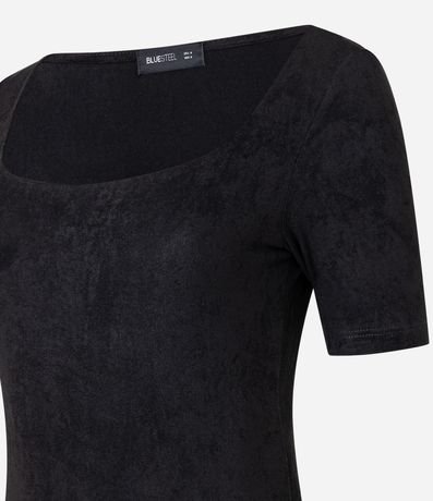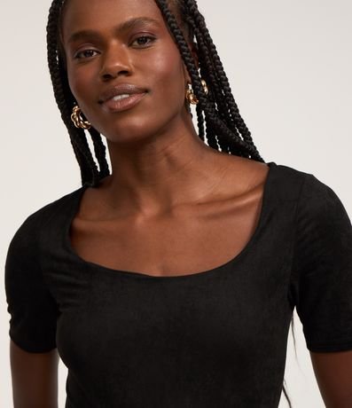 Ref: Body feminino, confeccionado em suede, com decote redondo, mangas 3/4 e superfície texturizada.