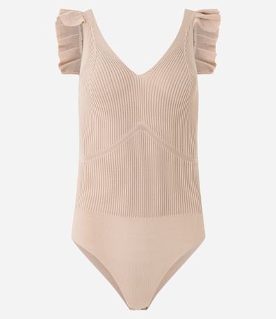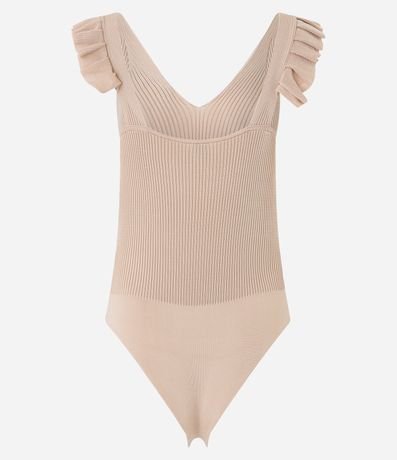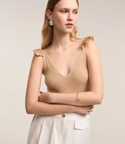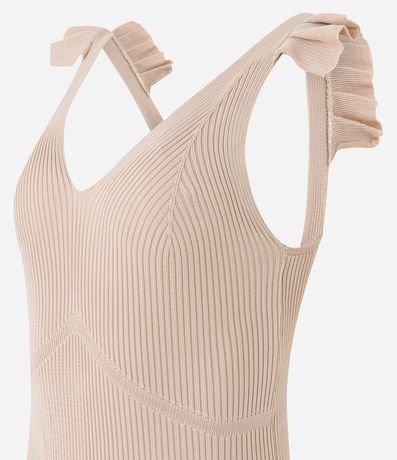Ref: Body feminino, confeccionado em tricô leve, com decote V, alças de babadinho e texturas.