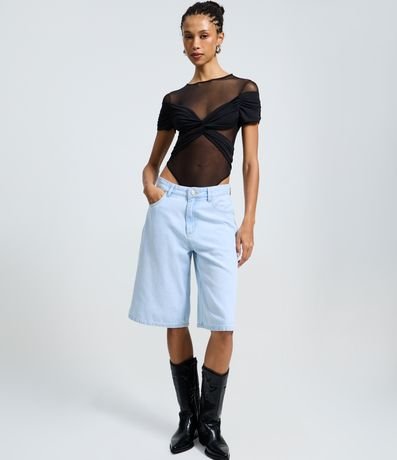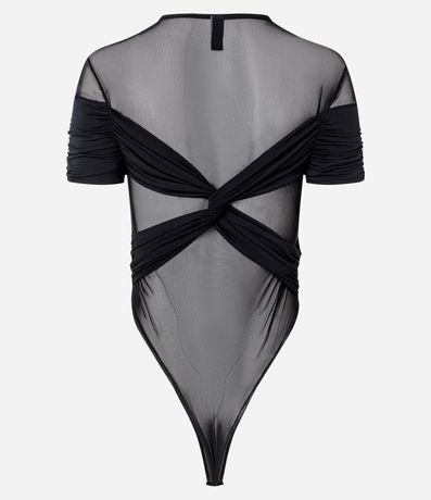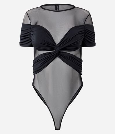 Ref: Body feminino confeccionado em tule. Possui decote canoa, manga curta e detalhe de sobreposição drapeado.