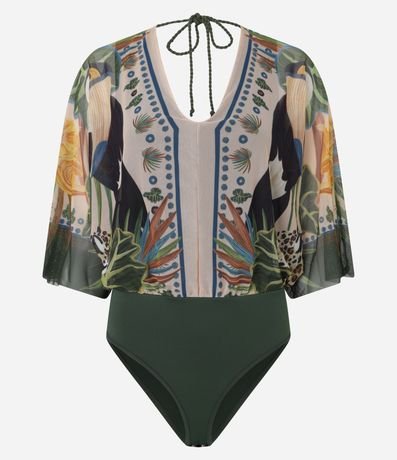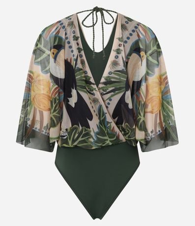 Ref: Body de tule estampado de folhagens e tucano. A peça tem decote frontal cruzado em V, mangas soltinhas amarração no pescoço e fechamento entrepernas.