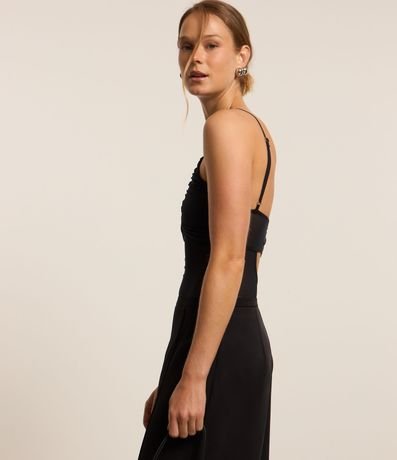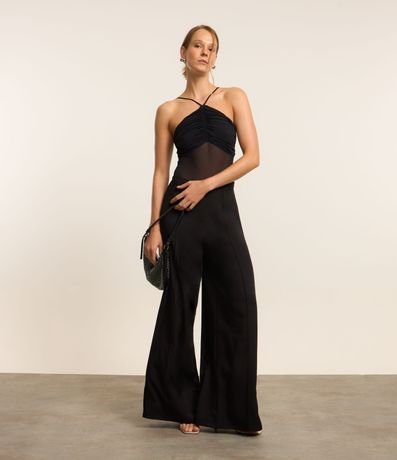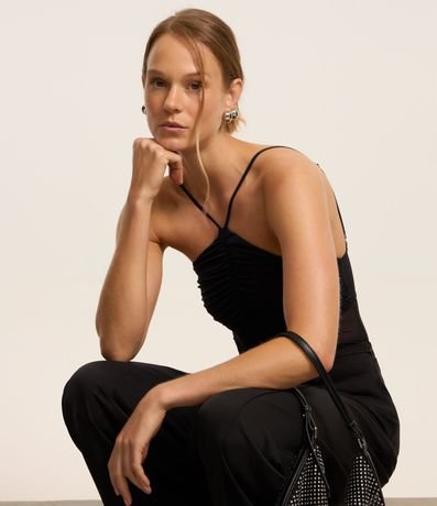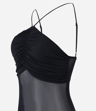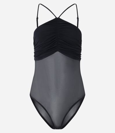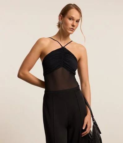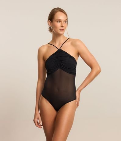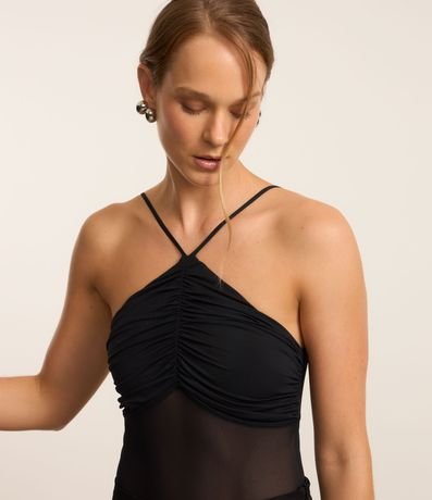 Body de alcinhas finas, decote halter, franzido no busto, transparência no corpo e costas abertas.