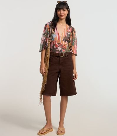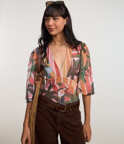 Body em Tule com Manga Ampla e Mix de Estampa Tropical