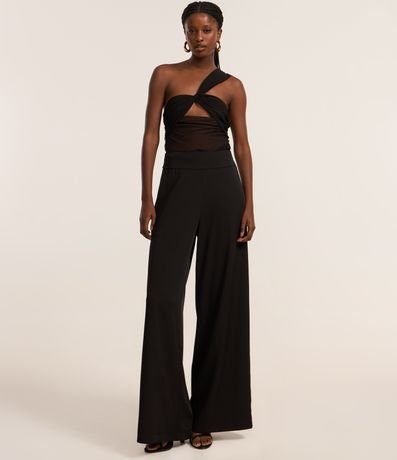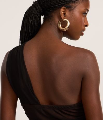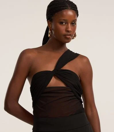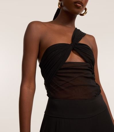 Body feminino em tule com ombro único e detalhe de nó no decote.