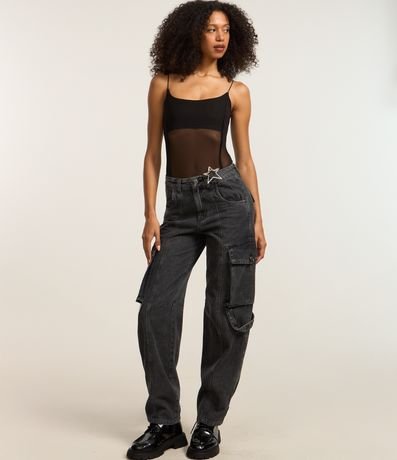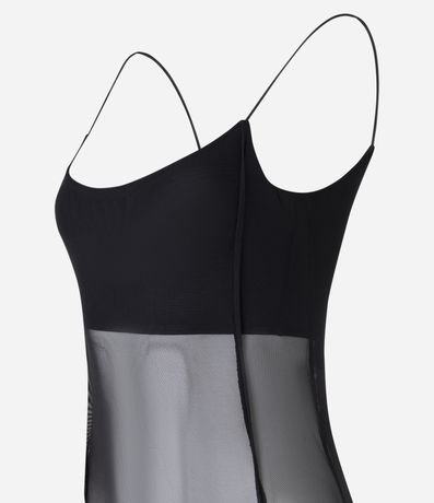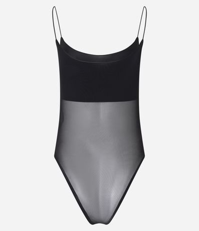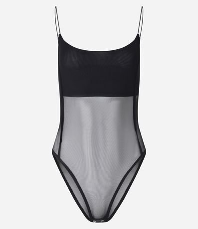 Ref: Body de alcinha fina, confeccionado em tule com recorte no busto, transparência e fechamento no entrepernas.